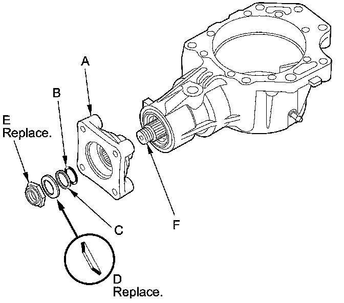 27. Install the companion flange (A), a new O-ring (B), back-up ring (C), a new conical spring washer (D), and a new locknut (E) on the transfer output shaft (hypoid gear) (F). Install the conical spring washer in the direction shown.
