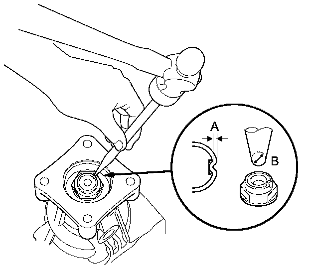 31. Stake the locknut to a depth (A) of at least 0.7 mm (0.03 in) using a 3.5 mm punch (B).