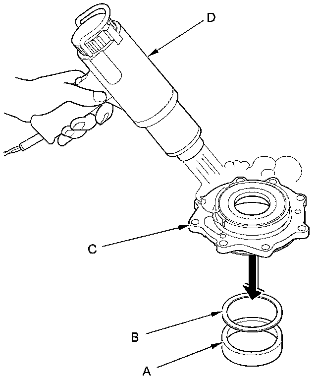 39. Remove the tapered roller bearing outer race (A) and the 80 mm thrust shim (B) from the transfer cover (C). If the tapered roller bearing outer race is press-fitted, remove the tapered roller bearing outer race by heating the transfer cover to about 212 °F (100 °C) using a heat gun (D). Do not heat the transfer cover more than 212 °F (100 °C).