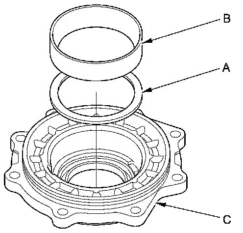41. Install the 80 mm trust shim (A) and tapered roller bearing outer race (B) in the transfer cover (C).