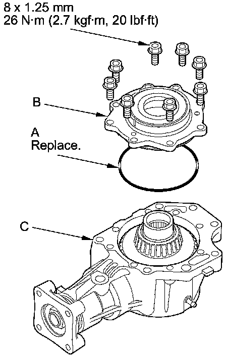 44. Install a new O-ring (A) on the transfer cover (B), then install the transfer cover on the transfer housing (C).