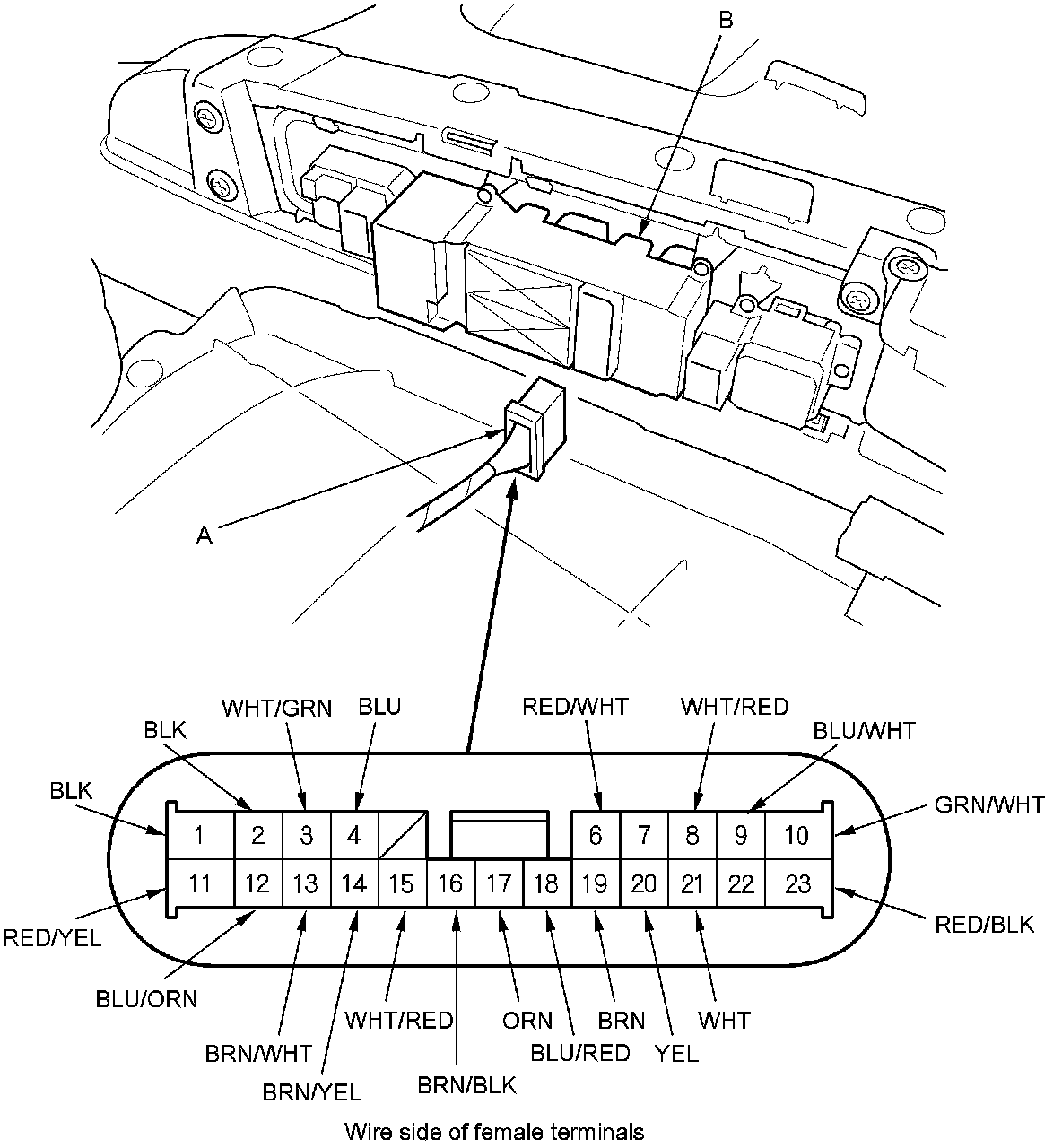 4. Disconnect the 23P connector (A) from the power window master switch (B).