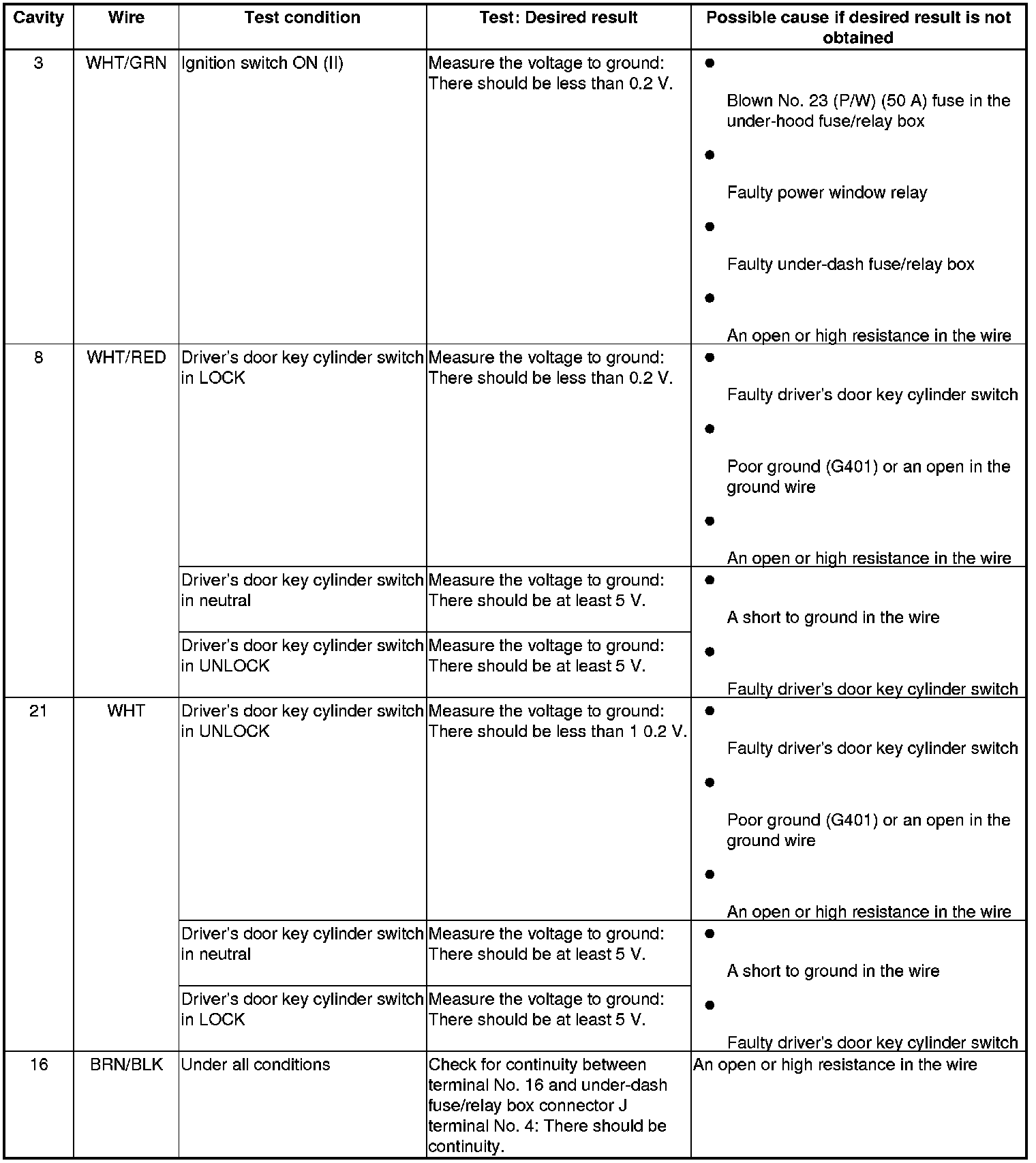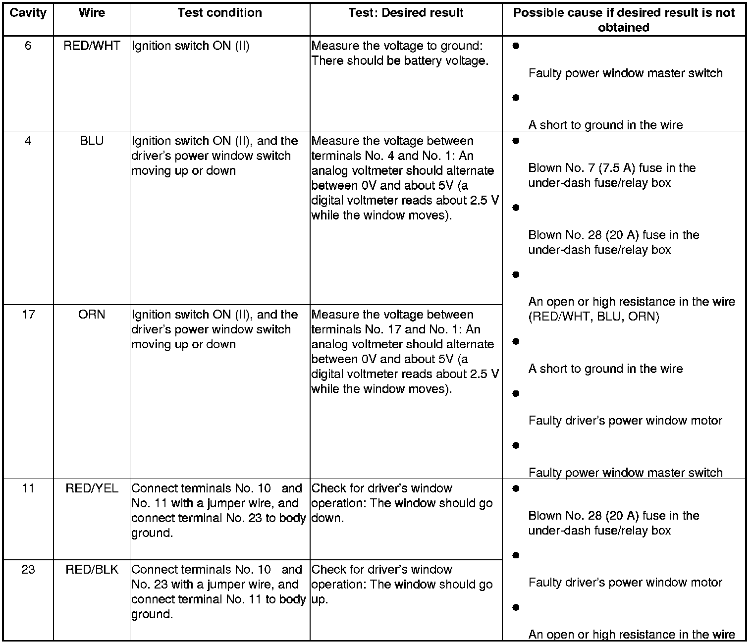 - If all the input tests prove OK, the control unit must be faulty; replace the power window master switch Power Window Master Switch Replacement, and go to step 8.