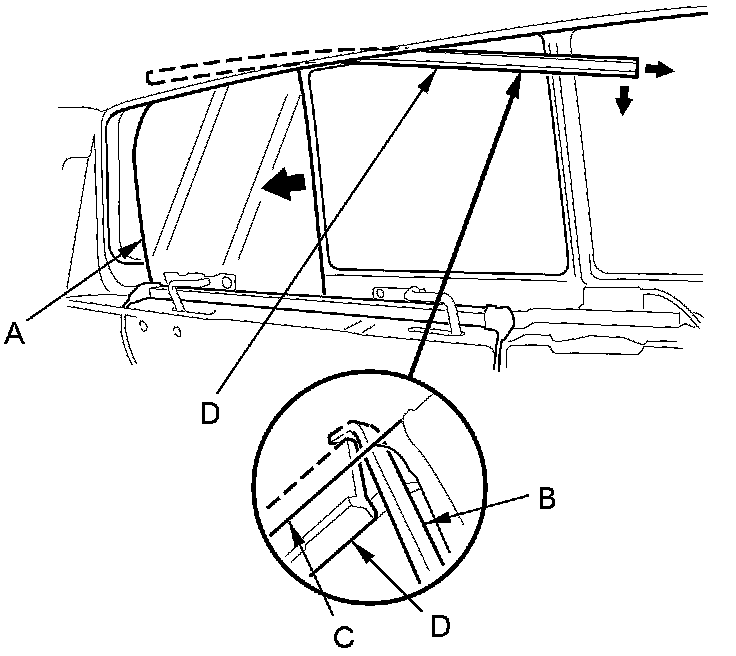 3. Open the middle glass (A) fully by hand. Insert a pick tool (B) into the glass run channel (C) as shown, and pull out the edge of the upper spacer (D), then pull out the spacer by hand from between the glass run channel and the glass.