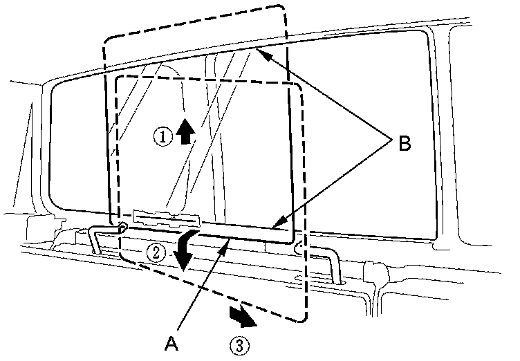 4. Move the glass (A) until you can remove it as shown. Pull up the glass to release the bottom of the glass, then pull out the top of the glass from the glass run channel (B). Carefully remove the glass.