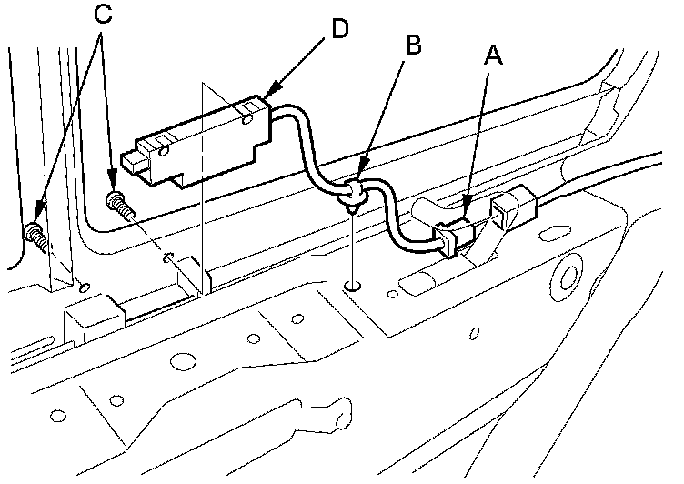 2. Disconnect the connector (A) and detach the harness clip (B). Remove the screws (C), then remove the back power window position switch (D).