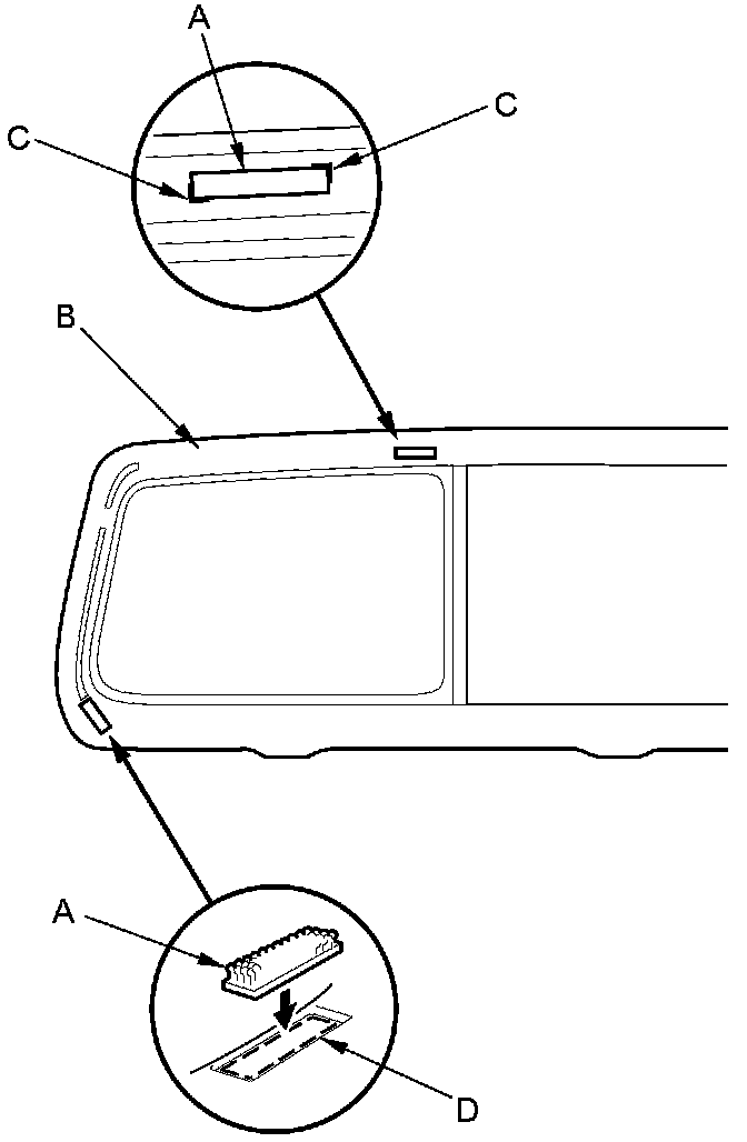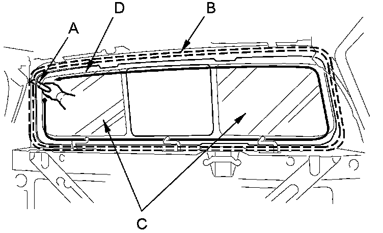 - If the back window (C) will be reinstalled, take care not to damage the molding (D).