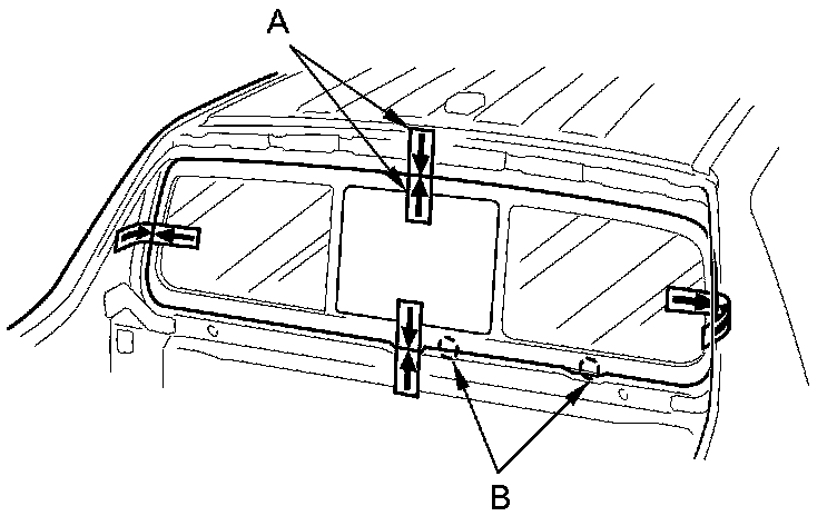 11. Set the back window in the opening, and center it. Make alignment marks (A) across the back window and the body with a grease pencil at the four points shown. Make sure insert nuts (B) are aligned in the body holes (inside). Be careful not to touch the back window molding where the adhesive will be applied.