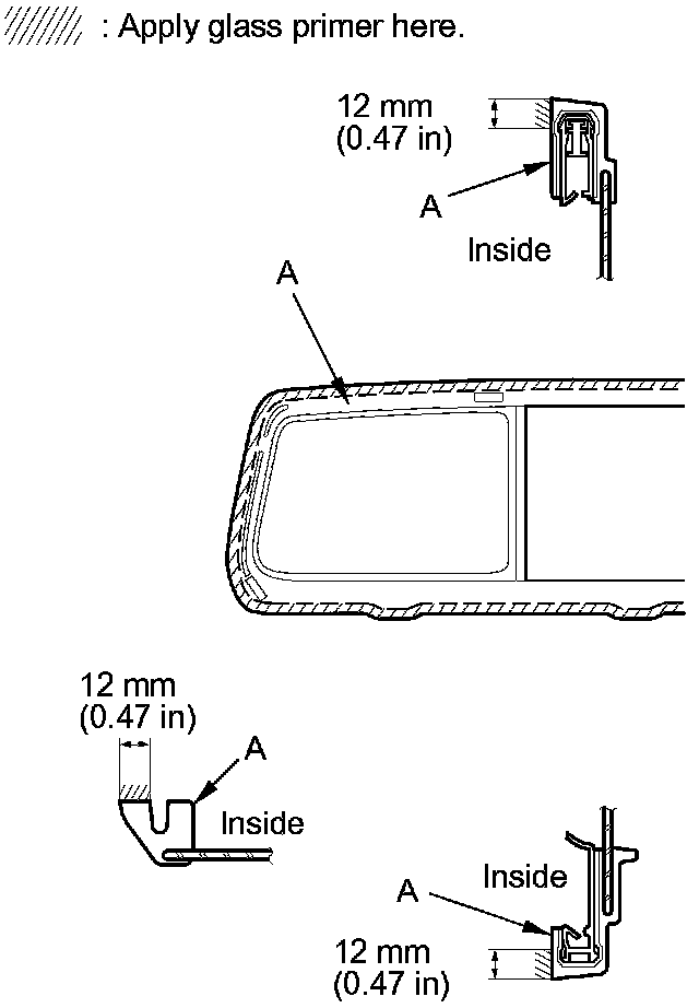13. Apply a light coat of glass primer along the edge of the back window molding (A) as shown, then lightly wipe it off with gauze or cheesecloth: