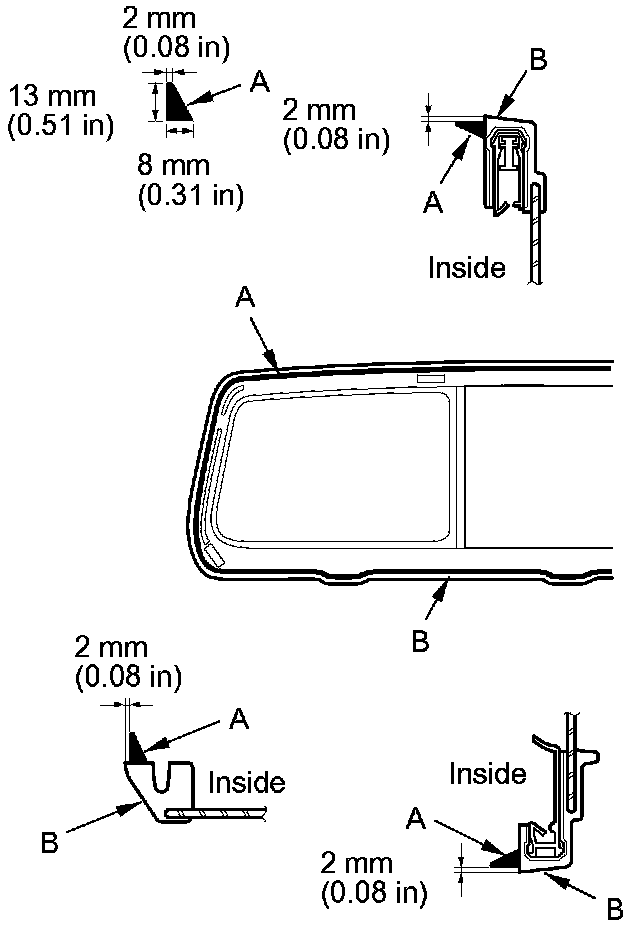 16. Put the cartridge in a caulking gun, and run a continuous bead of the adhesive (A) around the edge of the back window molding (B) as shown. Apply the adhesive within 30 minutes after applying the glass primer. Make a slightly thicker bead at each corner.