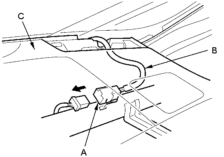 3. Disconnect the windshield defogger connector (A) through the glove box opening, and pull out the windshield defogger harness (B) from the tweeter grille opening in the dashboard (C).