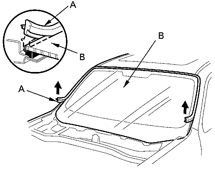 4. Remove the molding (A) from the edge of the windshield (B). If necessary, cut the molding with a utility knife.