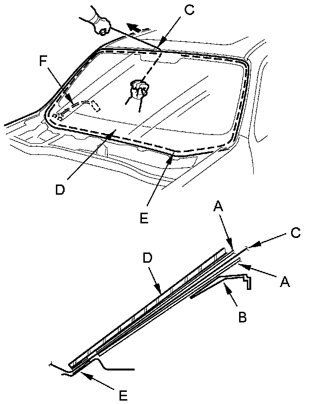 - Be sure the alignment mark (D) of the molding lines up with the alignment mark (E) of the windshield.