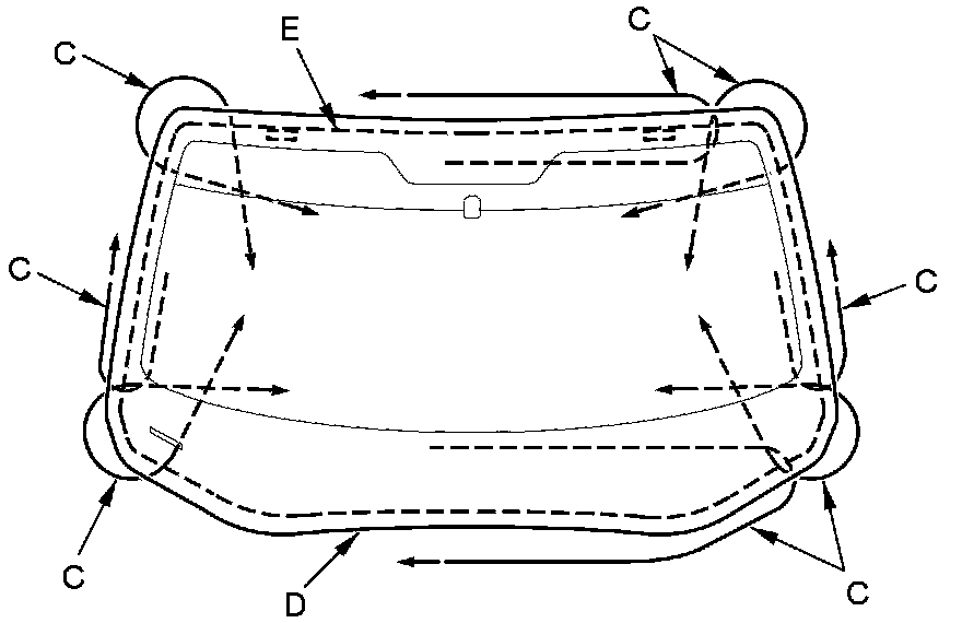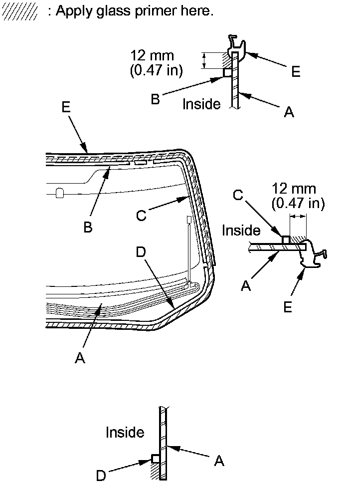 20. Apply a light coat of glass primer to the windshield (A) along the edge of the upper rubber dam (B), the side rubber dams (C), the lower rubber dam (D), and the molding (E) as shown, then lightly wipe it off with gauze or cheesecloth: