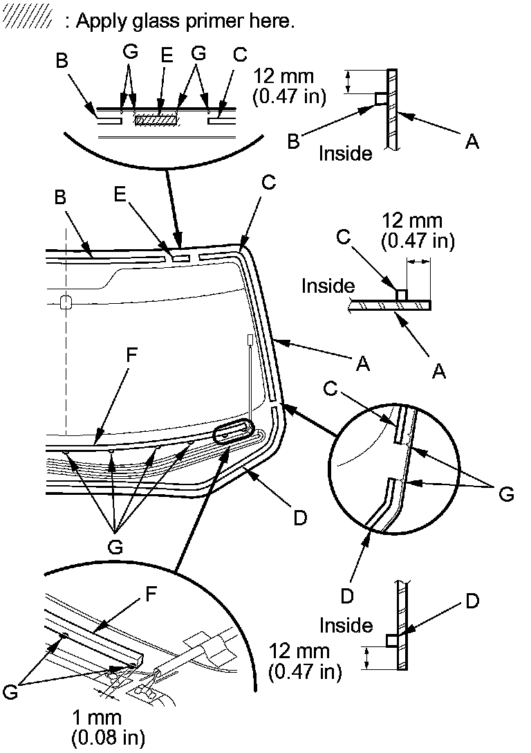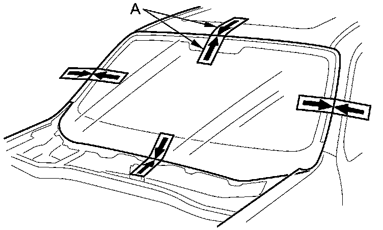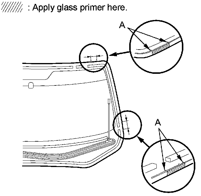 14. Apply glass primer to the edge of the windshield between the alignment marks (A). Be careful not to touch the windshield where adhesive will be applied.