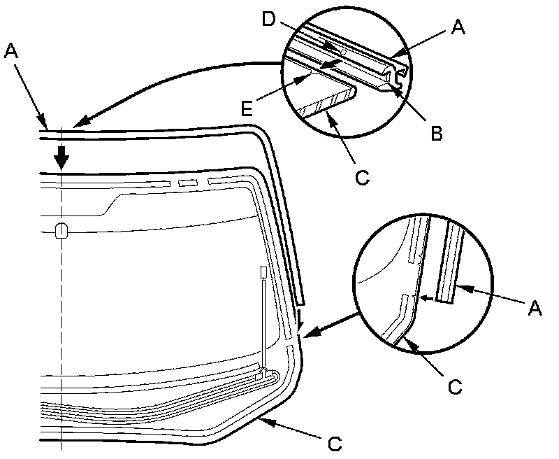 16. Attach the molding upper seals (A), the molding side seals (B), and the non woven fabric (C) to the inside surface of the molding (D), and attach the molding rubbers (E) with the adhesive tape to the inside surface of the molding lip (F) as shown:
