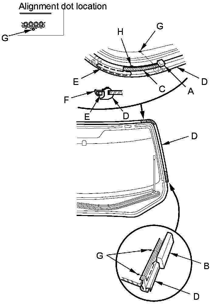 - Be sure the molding rubber lines up with the alignment mark (H) of the molding.