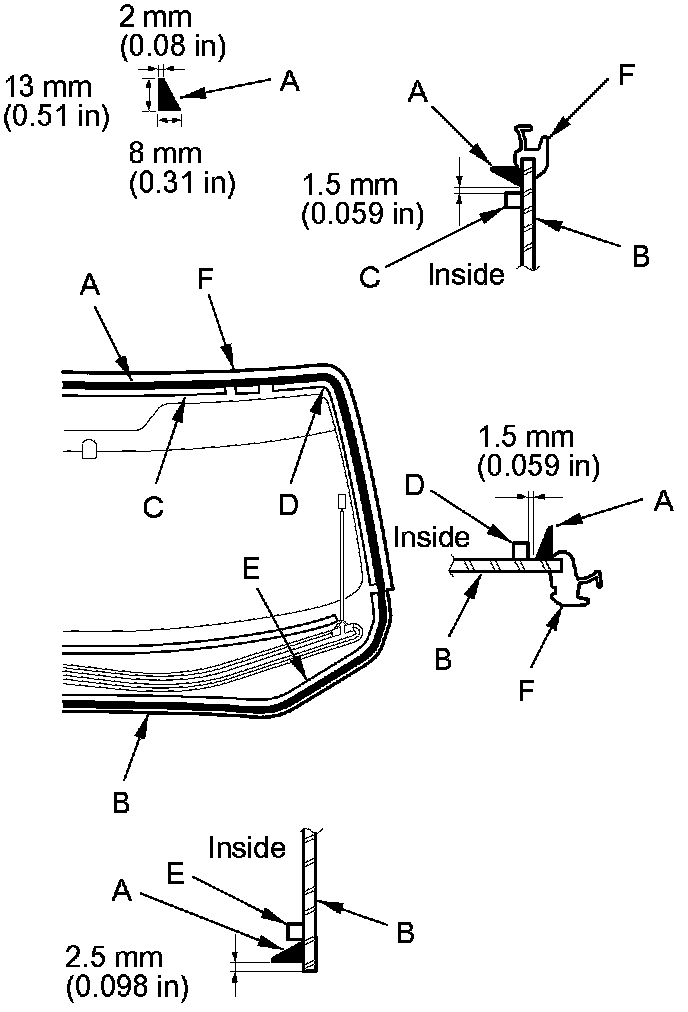 13. Apply glass primer to the fastener mounting area on the windshield (A), and let it dry. Remove the adhesive backing and attach the upper rubber dam (B), the side rubber dams (C), the lower rubber dam (D), the fasteners (E), and the dashboard seal (F) to the inside face of the windshield as shown.