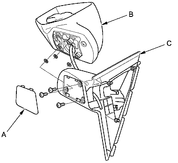 5. Remove the three screws, and separate the mirror housing (B) from the bracket (C).