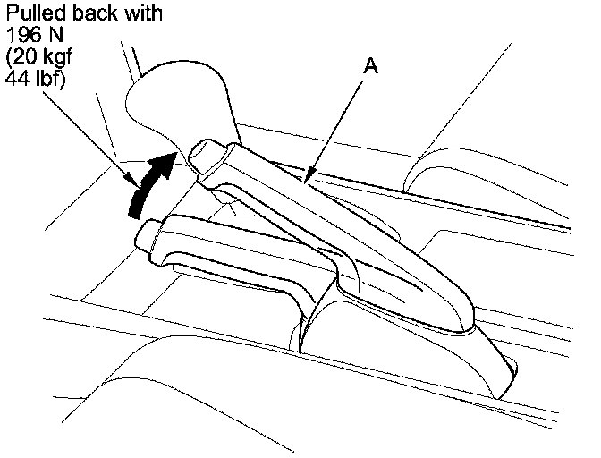 1. Pull the parking brake lever (A) with 196 N (20 kgf, 44 lbf) of force to fully apply the parking brake. The parking brake lever should be locked within the specified number of clicks.