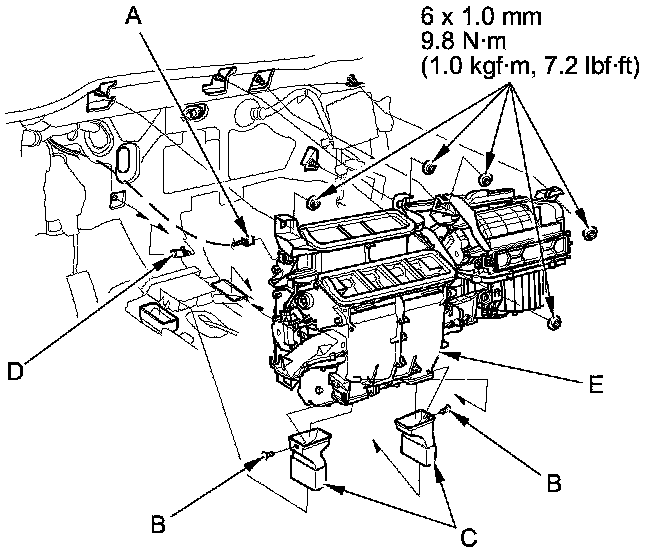 8. Disconnect the connector (A). Remove the clips (B), ducts (C), and the drain hose (D). Then remove the mounting bolt, the mounting nuts, and the blower-heater unit (E).
