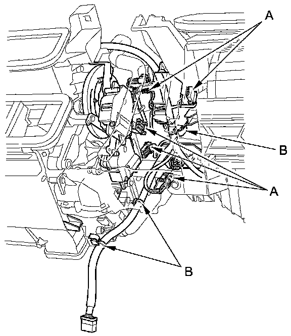 11. Disconnect these connectors (A): The mode control motor, the power transistor, the evaporator temperature sensor, the passenger's air mix control motor (with climate control), and the recirculation control motor. Detach the wire harness clips (B).