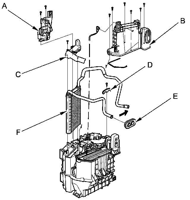 14. Remove the self-tapping screws, the heater pipe bracket (D), and the grommet (E), and carefully pull out the heater core (F).