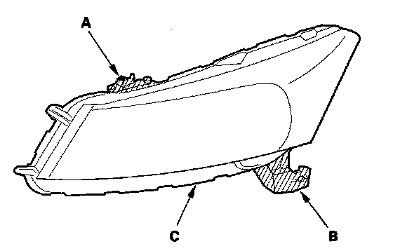 5. Cut or grind off the damaged side bracket (A) so that the bosses (B) of the headlight housing (C) are left as shown. After removing the damaged bracket, finish the cut area with 400 grit sandpaper. Take care not to scratch the headlight assembly.