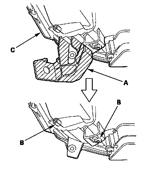 4. Install the upper repair bracket (A) on the bosses of the headlight housing (B), then fasten it with the screws (C) provided with the repair bracket.