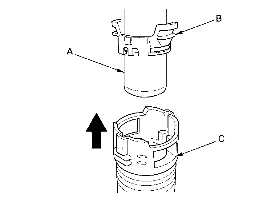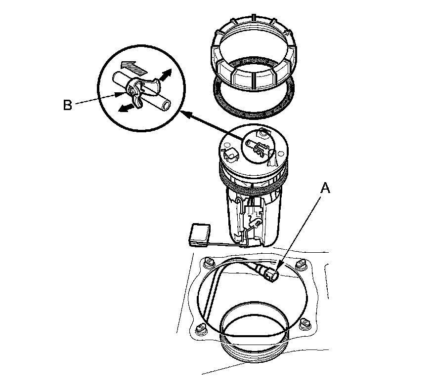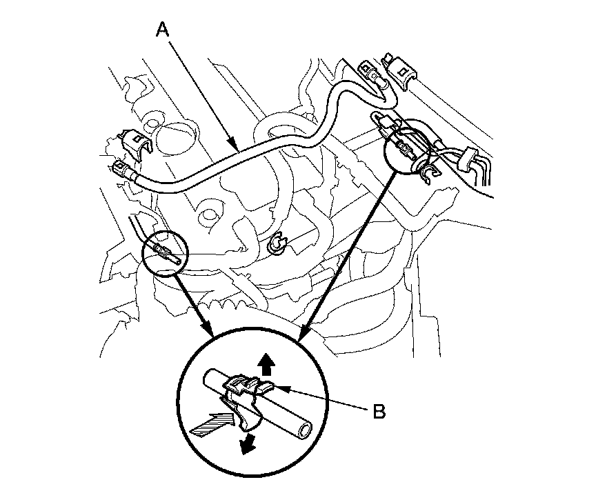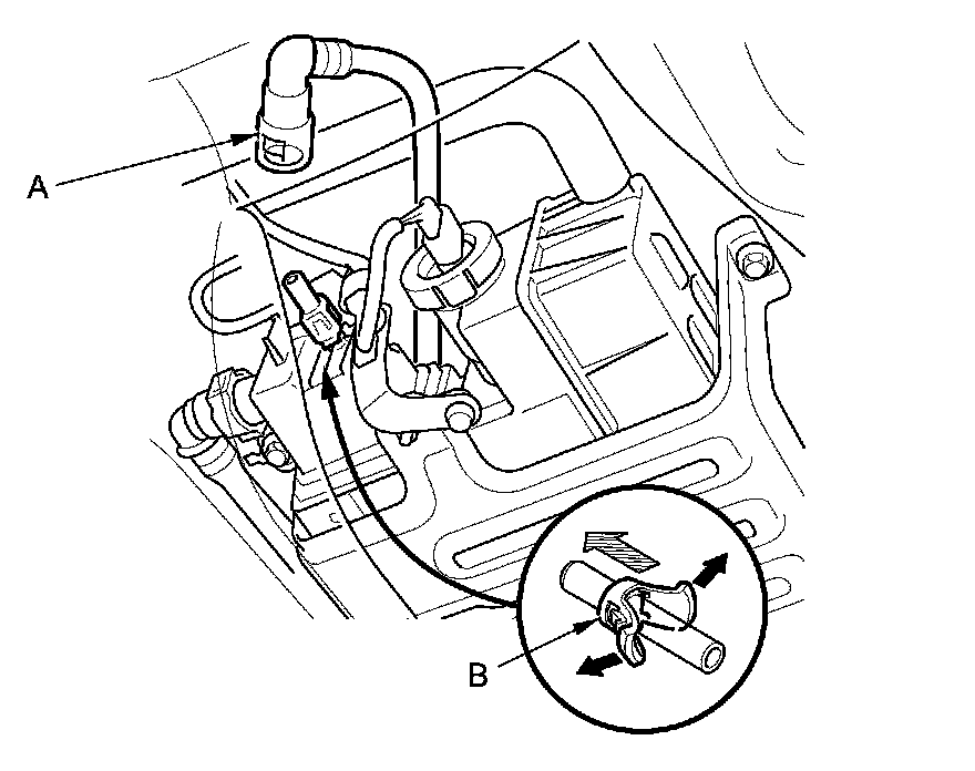 3. Before connecting a new fuel tube/quick-connect fitting assembly (A), remove the old retainer (B) from the mating line.