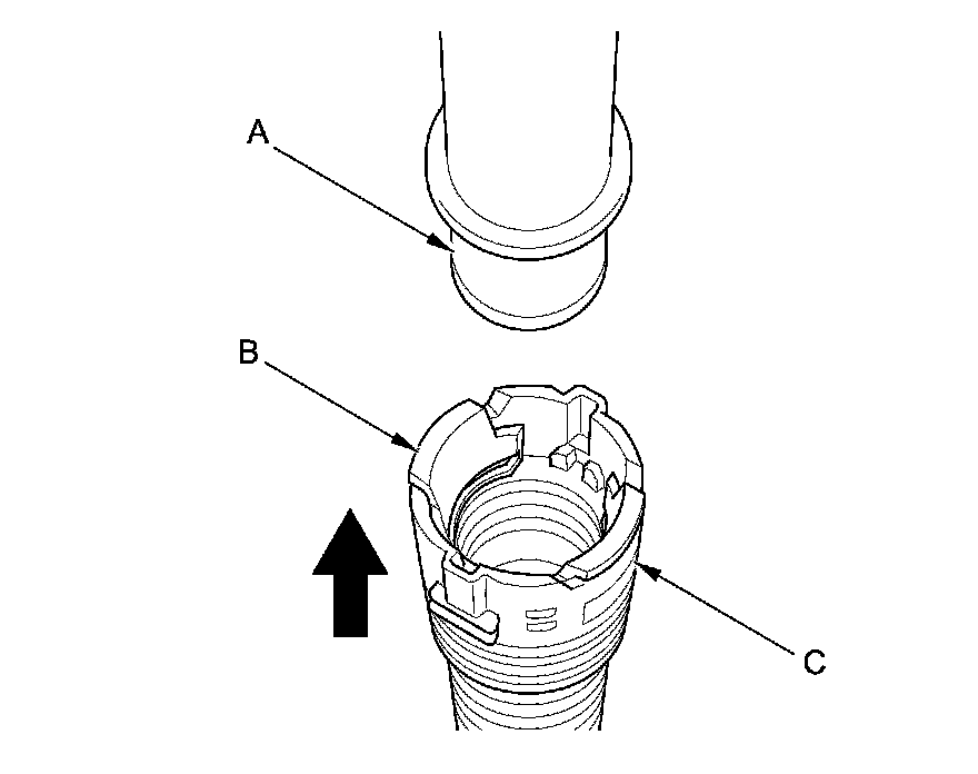 5. When you reconnect the connector with the old retainer, make sure the connection is secure and the tabs (A) are firmly locked into place; check visually and also by pulling the connector (B). When you replace the fuel line with a new one, make sure you remove the ring pull (C) upwards after you confirm the connection is secure.
