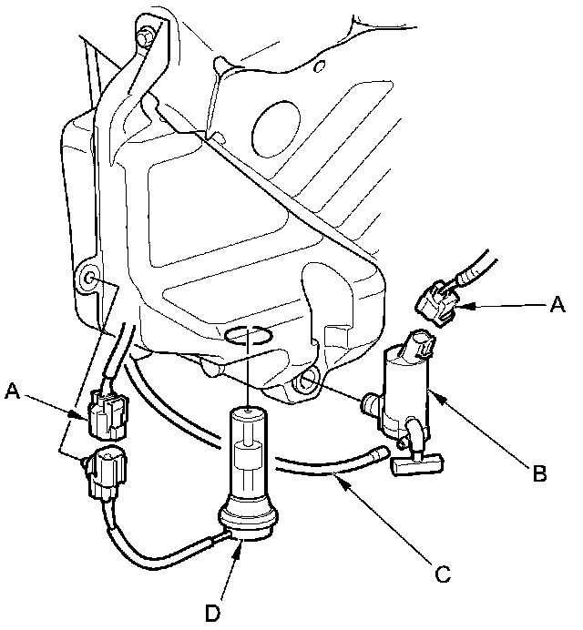 2. Disconnect the 2P connector(s) (A) from the washer motor (B) and the washer fluid level switch (D) (Canada models).