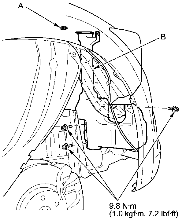 4. Remove the clip (A) and three bolts from the washer reservoir (B).
