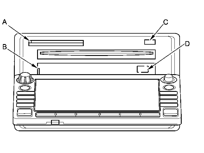 7. Press the CD eject button (C), and navigation DVD eject button (D) and remove the discs (hold the discs by their edges to avoid fingerprints). To avoid scratches, place the navigation DVD and the customer's CD in a jewel case if available.