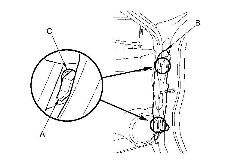 - Before installing the clip, make sure the hooks (A) of the front fender fairing (B) is installed into the holes (C) in the front fender securely.