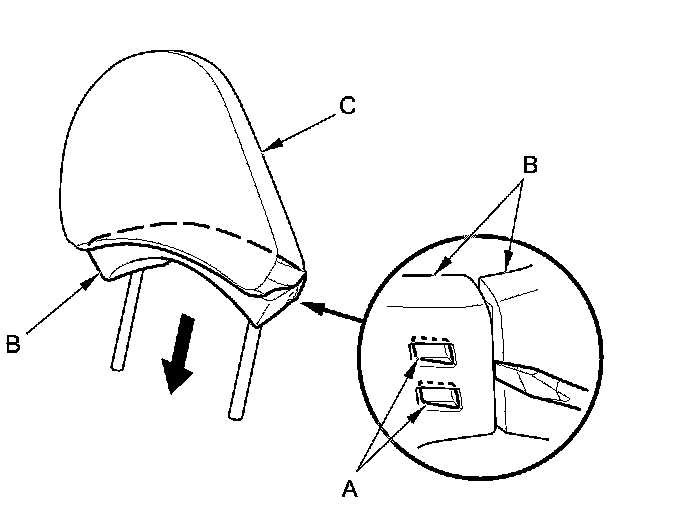 3. Detach the hooks (A), then separate the head restraint trim (B) and the rear head restraint trim (C).