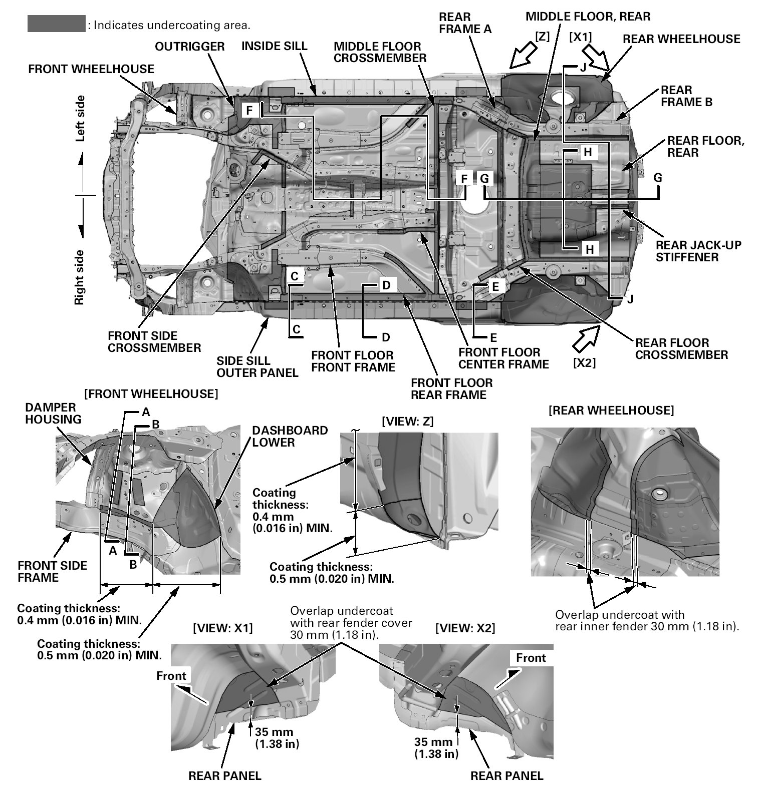 - Front wheelhouse, rear wheelhouse, and dashboard lower coating thickness 0.5 mm (0.020 in).