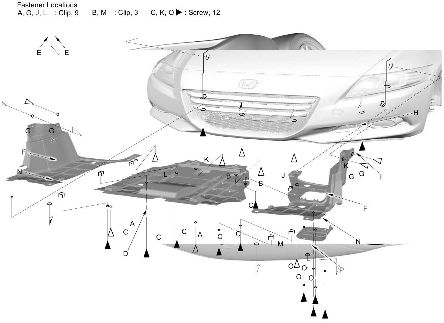 NOTE: To release the clips (G, J, L), pry up on the center pin at the notch (E).