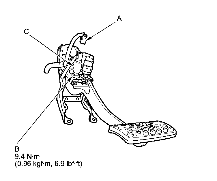 3. Loosen the locknut (B), and remove the idle stop switch (C).