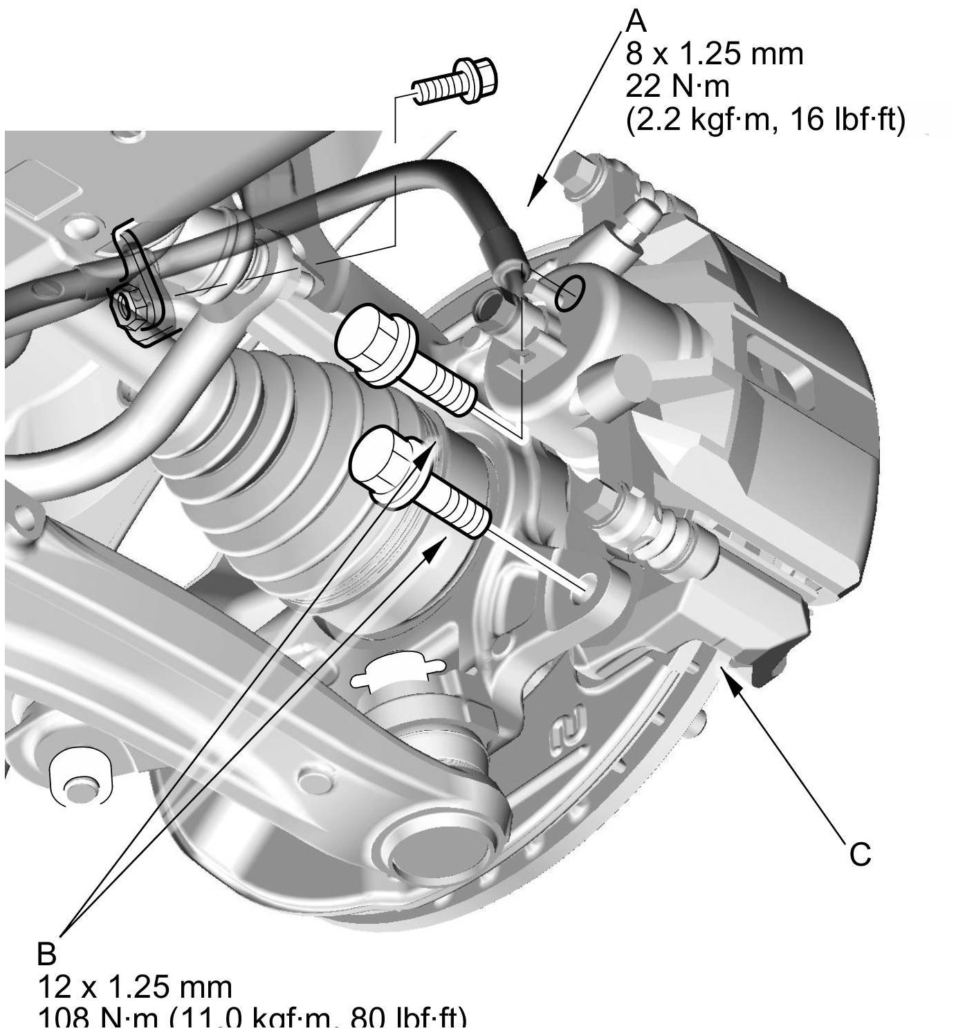 4. Remove the brake caliper bracket mounting bolts (B), then remove the caliper assembly (C) from the knuckle. To prevent damage to the caliper assembly or brake hose, use a short piece of wire to hang the caliper assembly from the undercarriage. Do not twist the brake hose excessively.