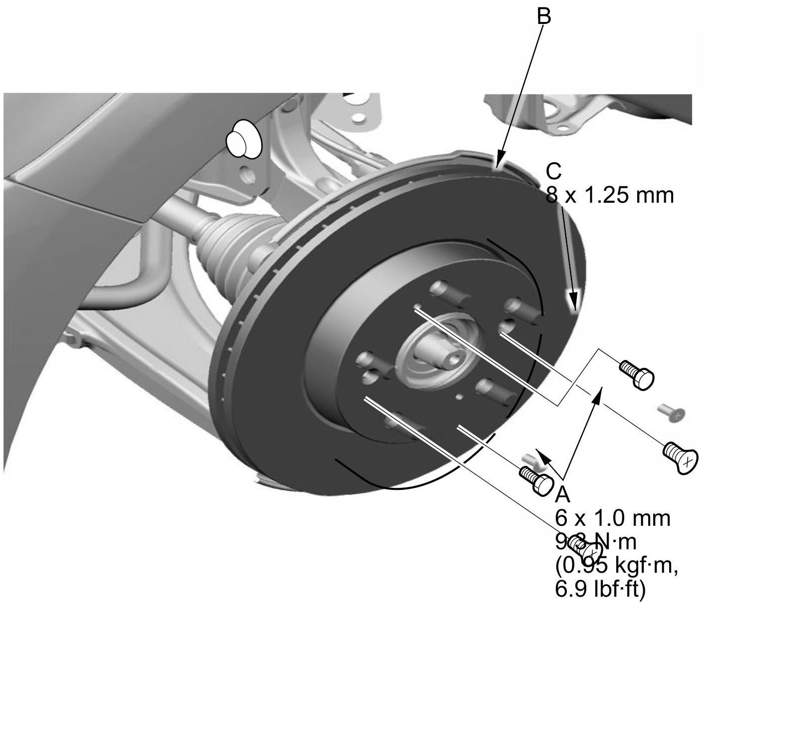 NOTE: If the brake disc is stuck to the front hub, thread two 8 x 1.25 mm bolts (C) into the brake disc to push it away from the front hub. Turn each bolt 90 degrees at a time to prevent the brake disc from binding.