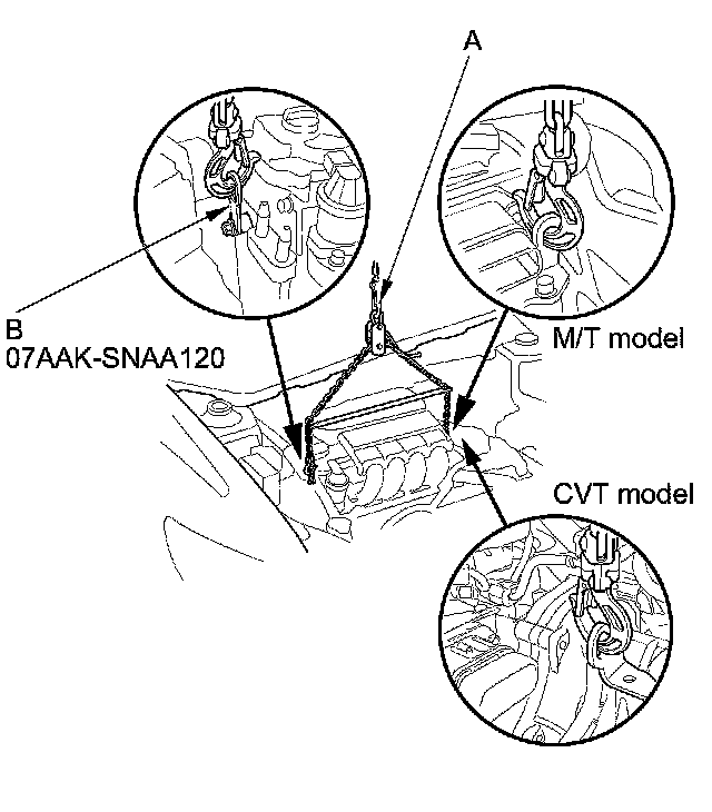 - Attach the first universal lifting eyelet (B) to the cam chain case.