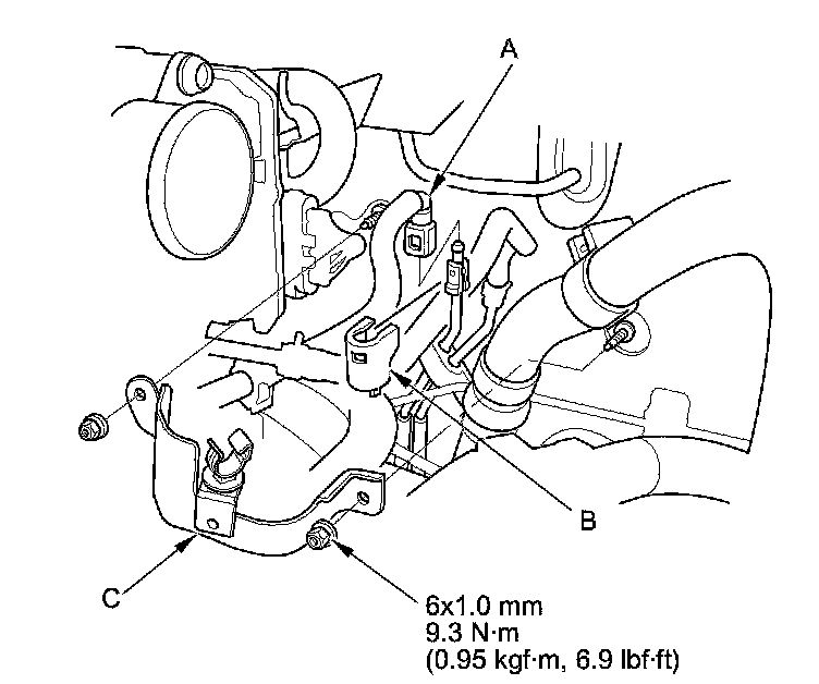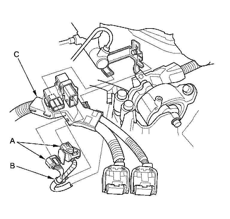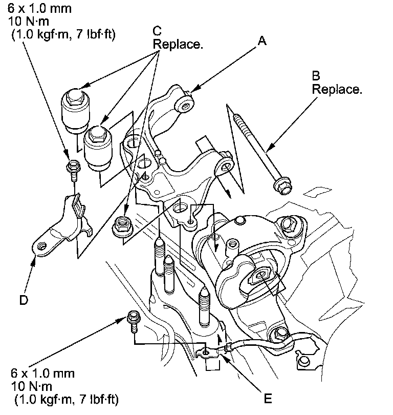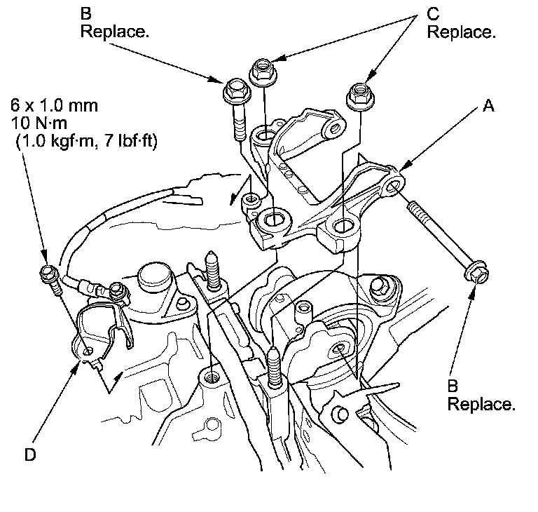 5. Install the transmission mount bracket (A), and loosely install the new transmission mount bracket mounting bolts (B) and nuts (C).
