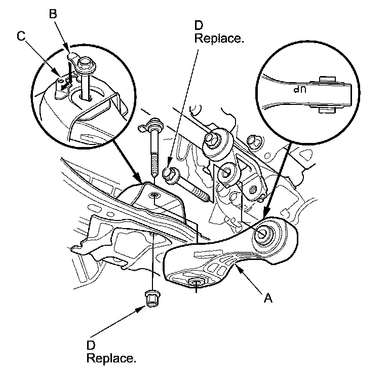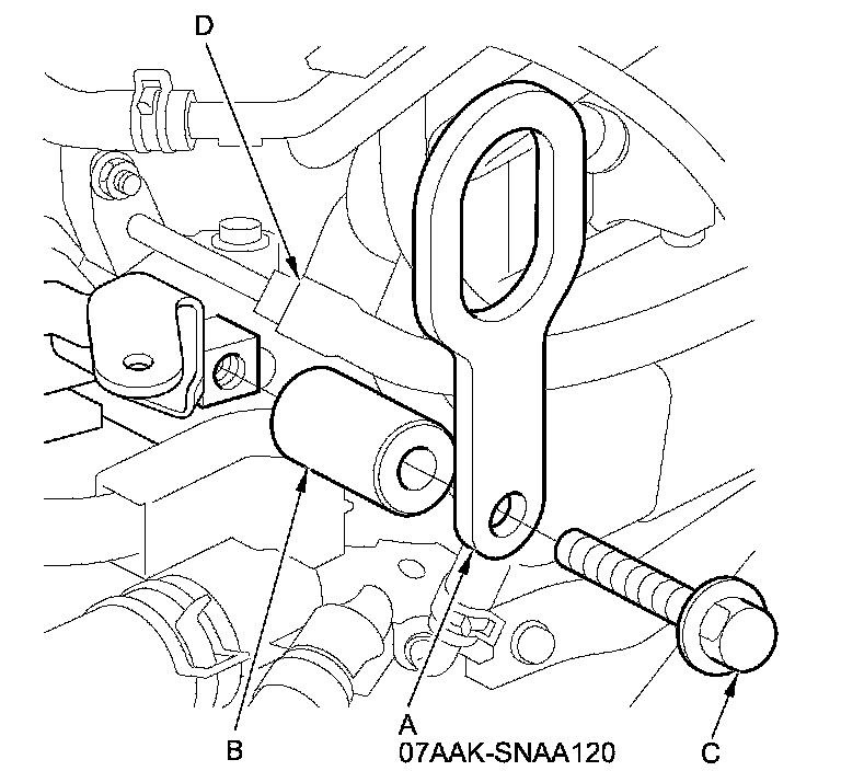16. Install the torque rod (A). Install the bolt with the tab (B) on the bolt head aligned with the guide (C) on the front subframe, then loosely install the new torque rod mounting bolt and nut (D).