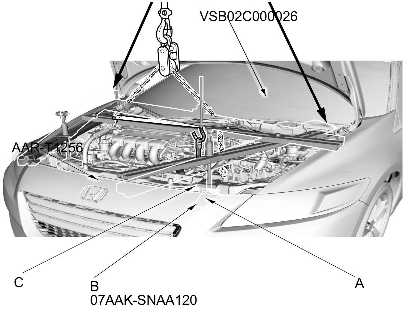 8. Install the engine hanger adapter (VSB02C000026) to the engine support hanger (AAR-T1256), then install the engine support hanger onto the vehicle, and attach the hook (A) to the second universal lifting eyelet (B). Tighten the wing nut (C) by hand, and lift and support the engine/IMA motor/transmission.