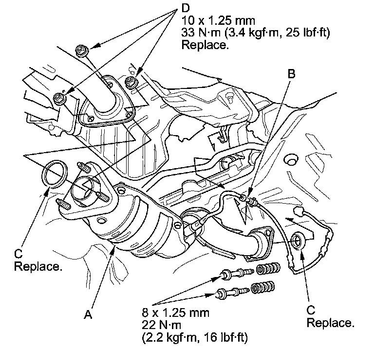 NOTE: Use new gaskets (C) and new self-locking nuts (D).