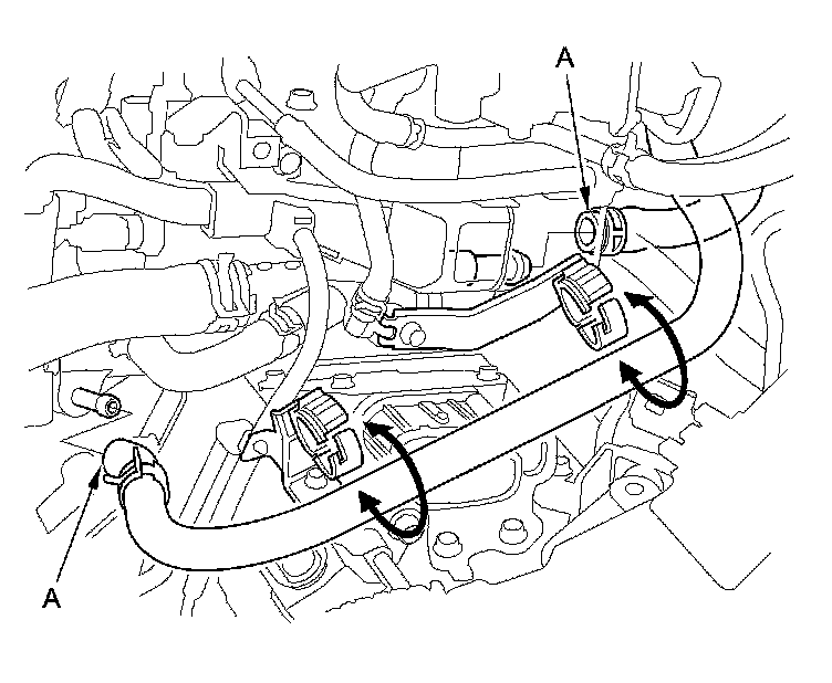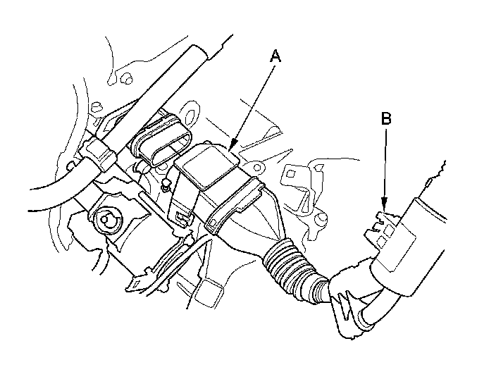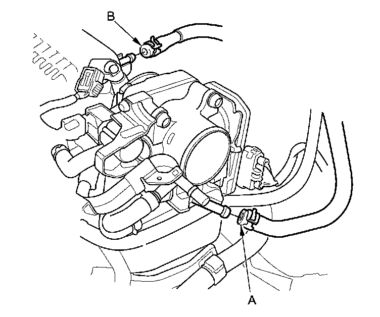 48. Install the EVAP canister hose (A) and the brake booster vacuum hose (B).