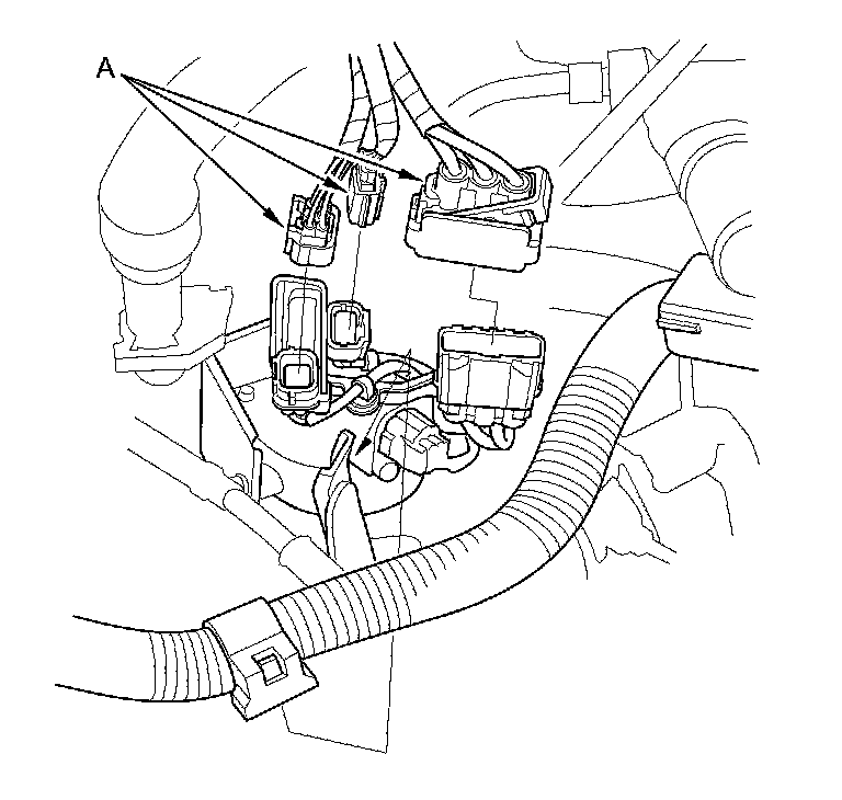 49. Connect the engine compartment wire harness connectors (A), then install the harness clamp (B).