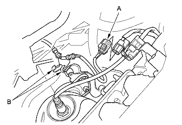 46. Connect the secondary HO2S connector (A), then install the secondary HO2S harness to the clamps (B).