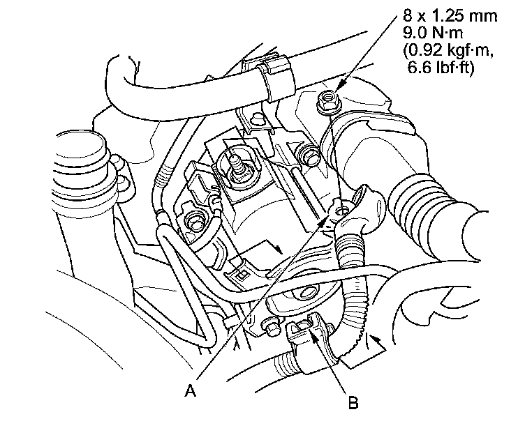 2. Install the side engine mount/bracket assembly (A), then tighten the new side engine mount/bracket assembly mounting bolts (B).